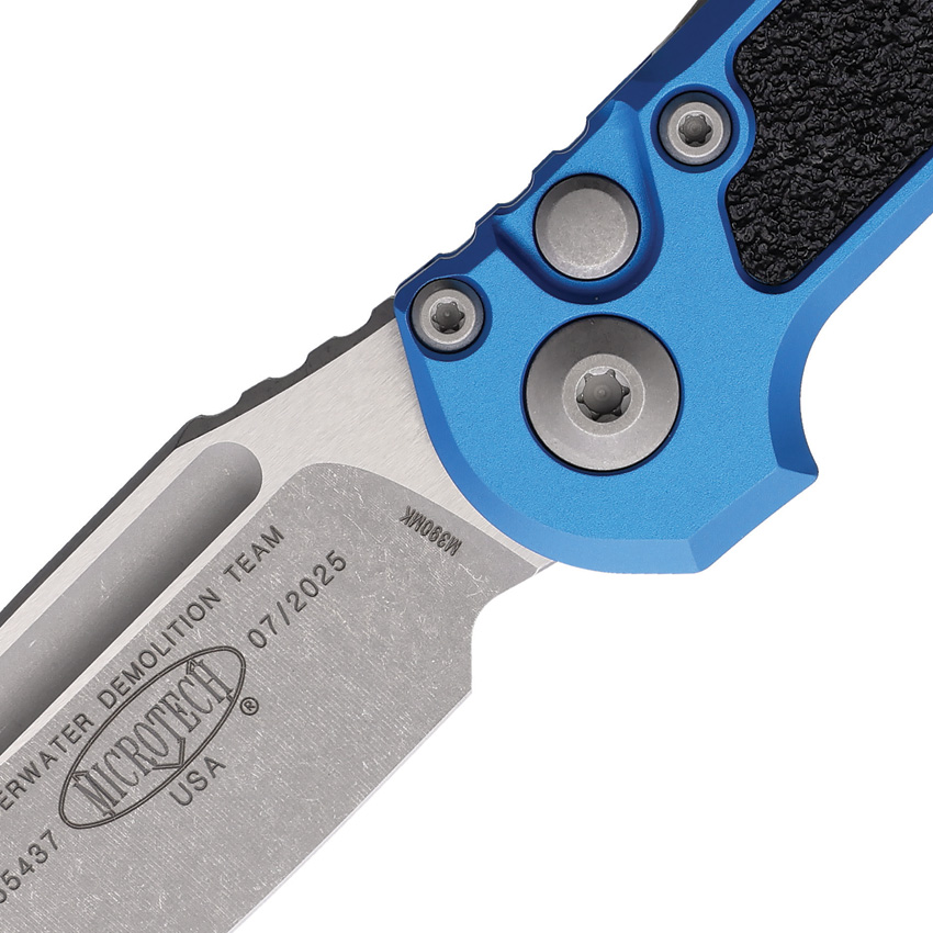 Automatic opening. 4.5″ (11.43cm) closed. 3.5″ (8.89cm) Apocalyptic finish Bohler M390MK stainless blade. Blue aluminum handle with black traction insert. Lanyard hole. Pocket clip. Boxed.