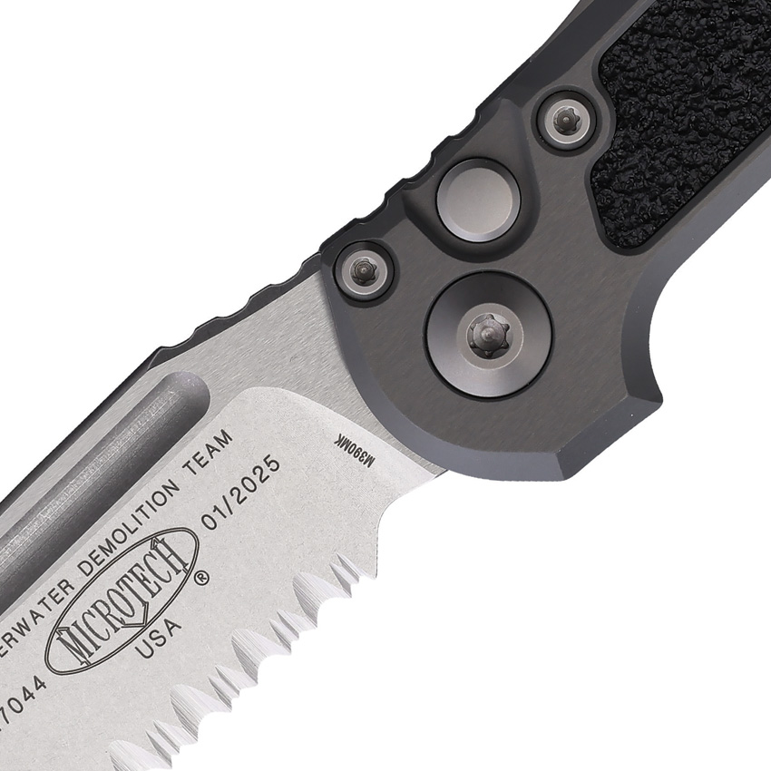 Automatic opening. 4.5″ (11.43cm) closed. 3.5″ (8.89cm) stonewash finish partially serrated Bohler M390MK stainless blade. Black aluminum handle with black traction insert. Lanyard hole. Pocket clip. Boxed.