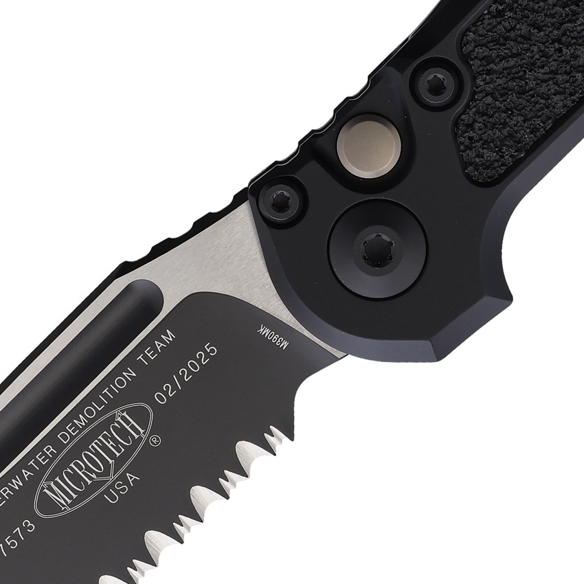 Automatic opening. 4.5″ (11.43cm) closed. 3.5″ (8.89cm) two-tone finish partially serrated Bohler M390MK stainless blade. Black aluminum handle with black traction insert. Lanyard hole. Pocket clip. Boxed.