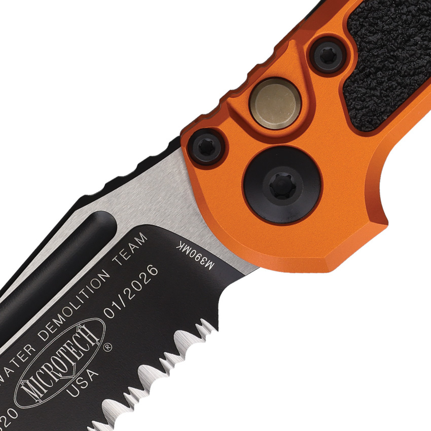 Automatic opening. 4.5″ (11.43cm) closed. 3.5″ (8.89cm) two-tone finish serrated Bohler M390MK stainless tanto blade. Orange aluminum handle with black traction insert. Lanyard hole. Pocket clip. Boxed.