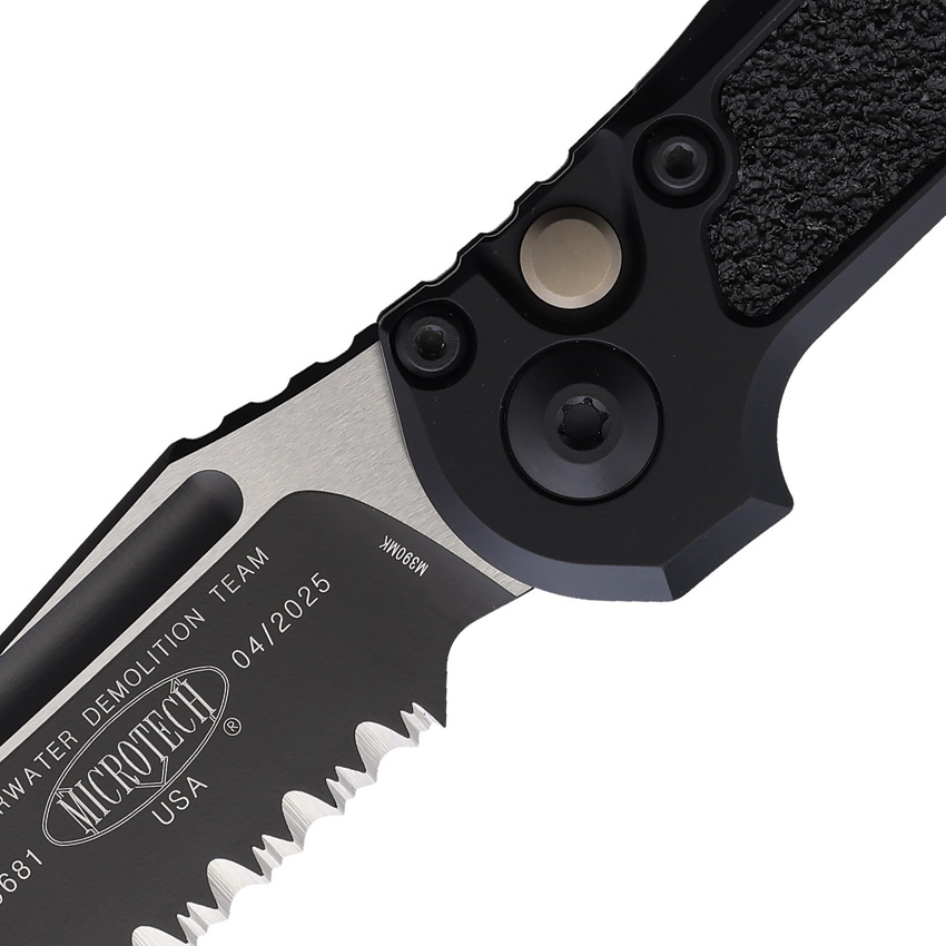 Automatic opening. 4.5″ (11.43cm) closed. 3.5″ (8.89cm) two-tone finish serrated Bohler M390MK stainless tanto blade. Black aluminum handle with black traction insert. Lanyard hole. Pocket clip. Boxed.