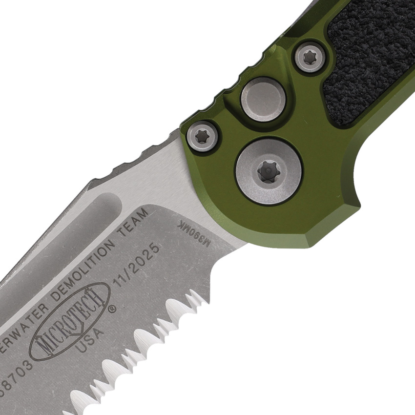 Automatic opening. 4.5″ (11.43cm) closed. 3.5″ (8.89cm) Apocalyptic finish partially serrated Bohler M390MK stainless tanto blade. OD green aluminum handle with black traction insert. Lanyard hole. Pocket clip. Boxed.