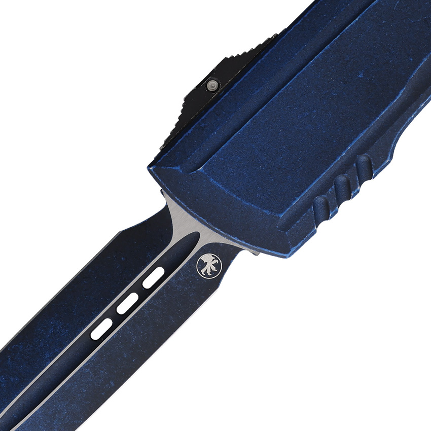 Automatic opening. 5″ (12.7cm) closed. 3.5″ (8.89cm) Bohler M390MK stainless blade. Aluminum handle. Glass breaker. Lanyard hole. Pocket clip. Weathered blue blade and handle. Tritium button insert.
