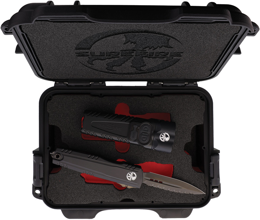 5″ (12.7cm) closed. 3.5″ (8.89cm) black stonewash finish serrated premium steel dagger blade. Black aluminum handle. Each set includes Microtech Auto Luminary OTF and SureFire Stiletto Pro II flashlight. 1500 max lumens with 1 hour runtime. Integrated lithium battery. 4.88″ overall. Comes with hardside carry case. Each serialized, limited-edition box set also includes a commemorative challenge coin and a certificate of authenticity card. Boxed.