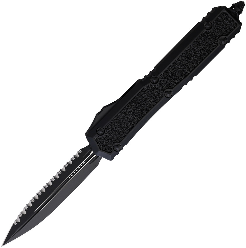Automatic opening. 5.13″ (13.03cm) closed. 3.38″ (8.59cm) black Cerakote finish serrated stainless dagger blade. Black anodized aluminum handle with black textured insert. Glass breaker. Lanyard hole. Pocket clip. Double edge blade. Nickel Boron internals. Signature Series. Boxed.