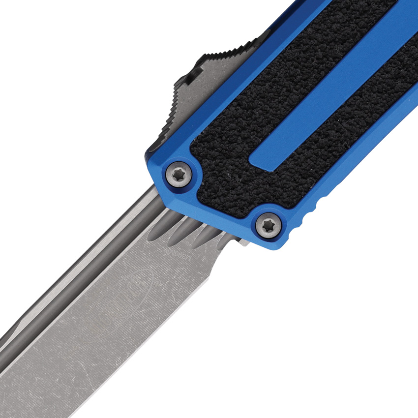 Automatic opening. 5.75″ (14.61cm) closed. 3.9″ (9.91cm) Apocalyptic finish Bohler M390MK stainless blade. Blue aluminum handle with black traction insert. Glass breaker. Lanyard hole. Pocket clip. Boxed.