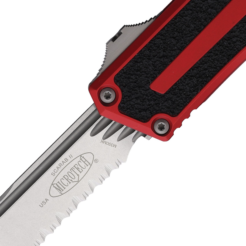 Automatic opening. 5.75″ (14.61cm) closed. 3.9″ (9.91cm) stonewash finish partially serrated Bohler M390MK stainless blade. Red aluminum handle with black traction insert. Glass breaker. Lanyard hole. Pocket clip. Boxed.