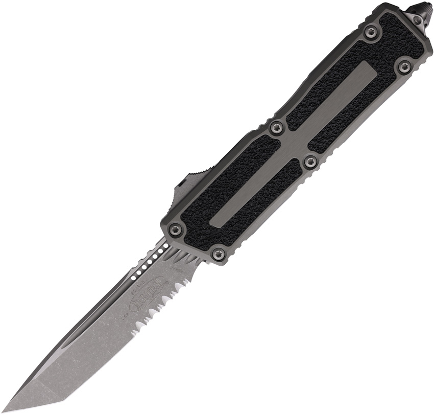 Automatic opening. 5.75″ (14.61cm) closed. 3.9″ (9.91cm) Apocalyptic finish partially serrated Bohler M390MK stainless tanto blade. Gray aluminum handle with black traction insert. Glass breaker. Lanyard hole. Pocket clip. Boxed.