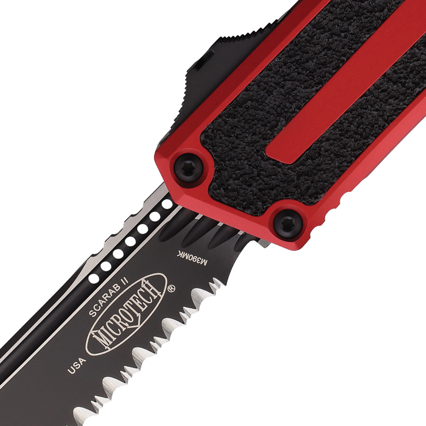 Automatic opening. 5.75″ (14.61cm) closed. 3.9″ (9.91cm) two-tone finish serrated Bohler M390MK stainless tanto blade. Red aluminum handle with black traction insert. Glass breaker. Lanyard hole. Pocket clip. Boxed.