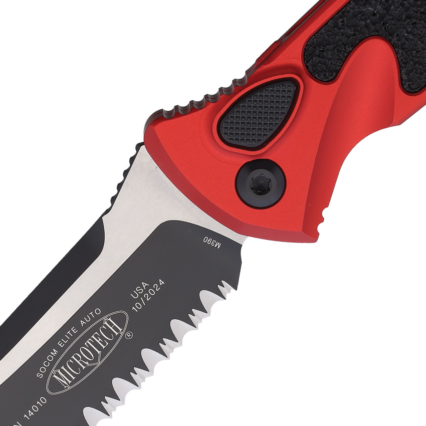Automatic opening. 5.13″ (13.03cm) closed. 4″ (10.16cm) two-tone finish partially serrated premium steel blade. Red aluminum handle with black traction insert. Boxed.