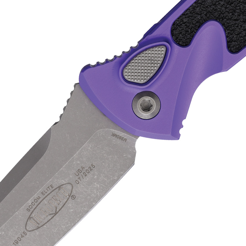 Automatic opening. 5.13″ (13.03cm) closed. 4″ (10.16cm) Apocalyptic finish premium steel tanto blade. Purple aluminum handle with black traction insert. Thumb stud. Lanyard hole. Glass breaker. Pocket clip. Boxed.