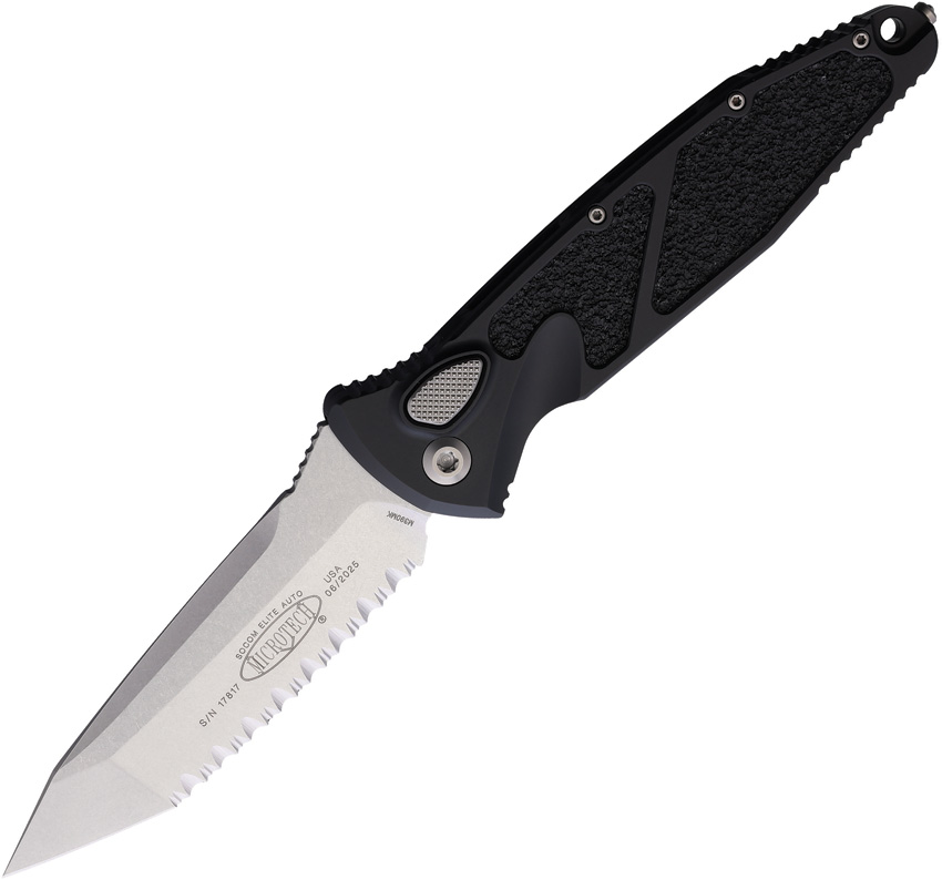 Automatic opening. 5.13″ (13.03cm) closed. 4″ (10.16cm) two-tone finish serrated premium steel blade. Black aluminum handle with black traction insert. Thumb stud. Lanyard hole. Glass breaker. Pocket clip. Boxed.
