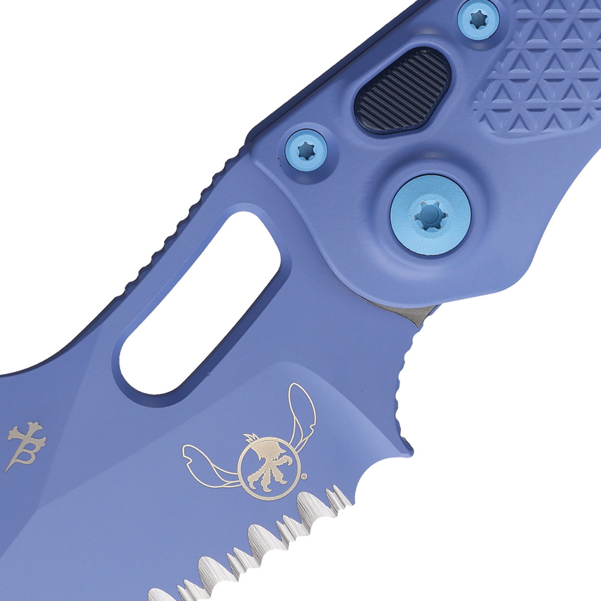 Automatic opening. 5″ (12.7cm) closed. 3.75″ (9.53cm) serrated premium steel Wharncliffe blade. Aluminum handle. Thumb pull. Lanyard hole. Pocket clip. Light blue blade and handle. Pink backspacer. Boxed.