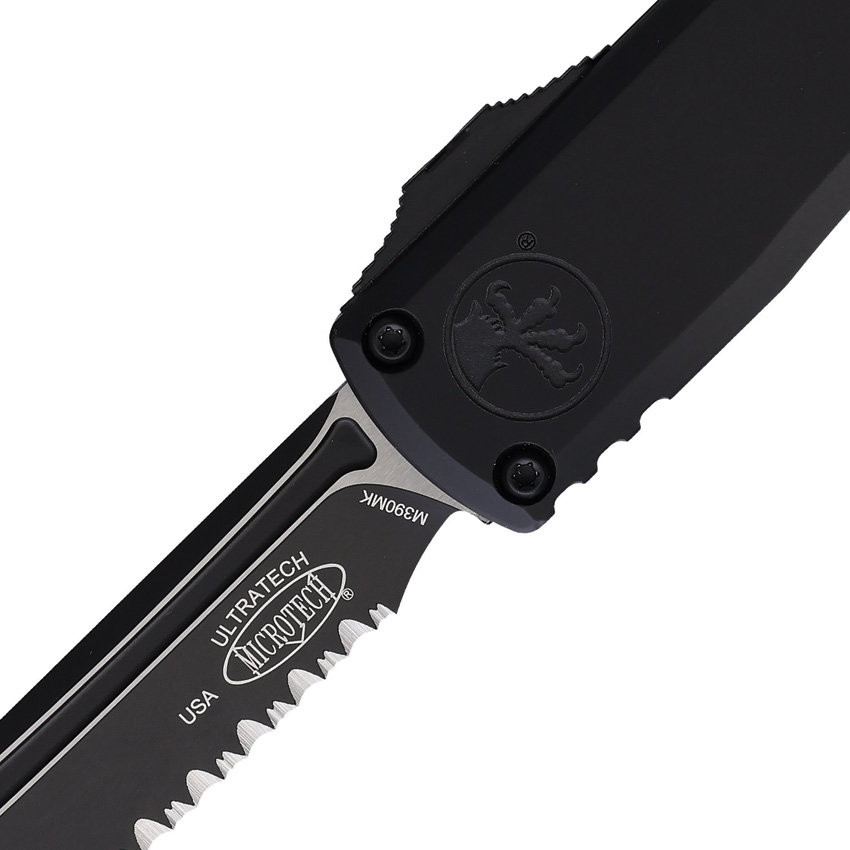 Automatic opening. 5″ (12.7cm) closed. 3.5″ (8.89cm) two-tone finish serrated Bohler M390MK stainless tanto blade. Black aluminum handle. Glass breaker. Lanyard hole. Pocket clip. Boxed.