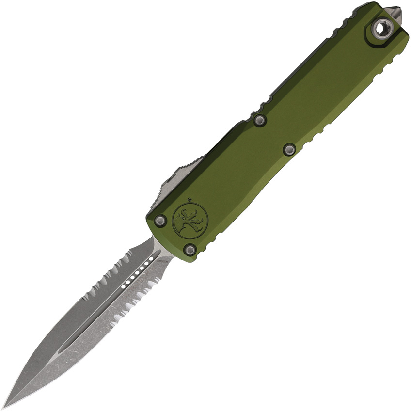 Automatic opening. 5″ (12.7cm) closed. 3.5″ (8.89cm) Apocalyptic finish partially serrated Bohler M390MK stainless dagger blade. OD green aluminum handle. Pocket clip. Lanyard hole. Glass breaker. Boxed.
