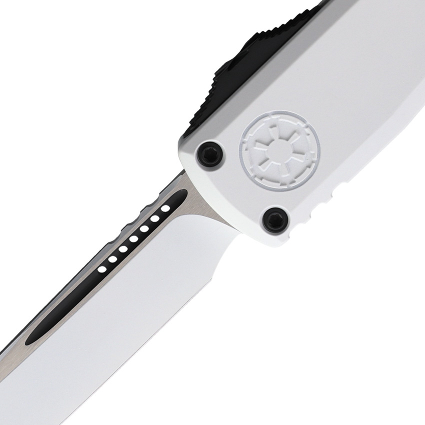 Automatic opening. 5″ (12.7cm) closed. 3.5″ (8.89cm) white coated Bohler M390MK stainless blade. White aluminum handle. Glass breaker. Lanyard hole. Pocket clip. Black accents. Boxed.