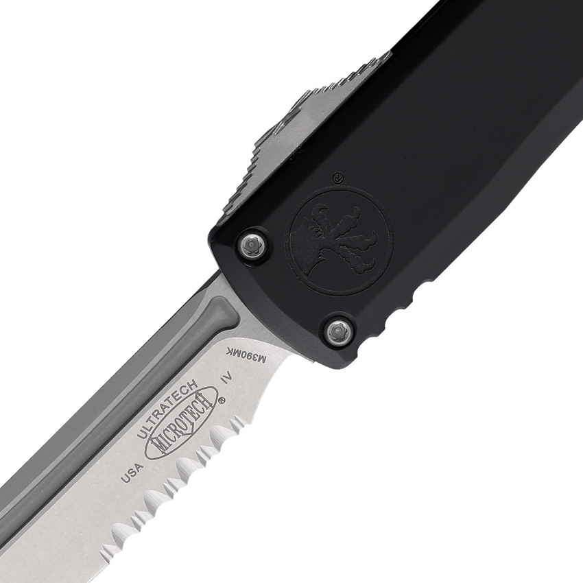 Automatic opening. 5″ (12.7cm) closed. 3.5″ (8.89cm) stonewash finish partially serrated Bohler M390MK stainless tanto blade. Black aluminum handle. Glass breaker. Lanyard hole. Pocket clip. Boxed.
