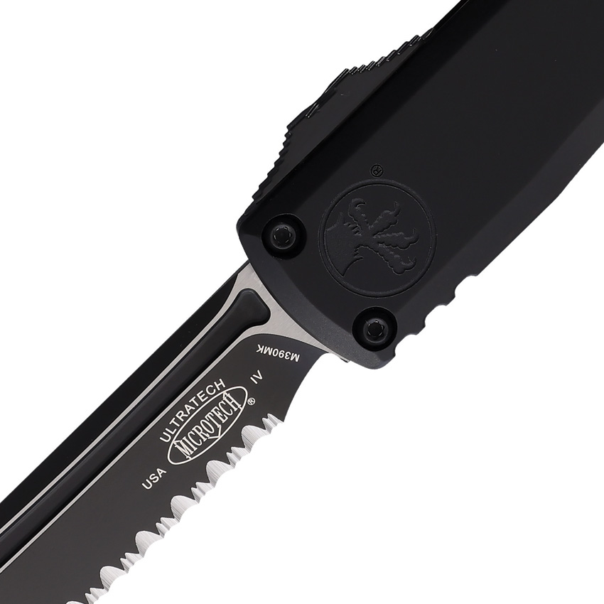 Automatic opening. 5″ (12.7cm) closed. 3.5″ (8.89cm) two-tone finish serrated Bohler M390MK stainless tanto blade. Black aluminum handle. Glass breaker. Lanyard hole. Pocket clip. Boxed.