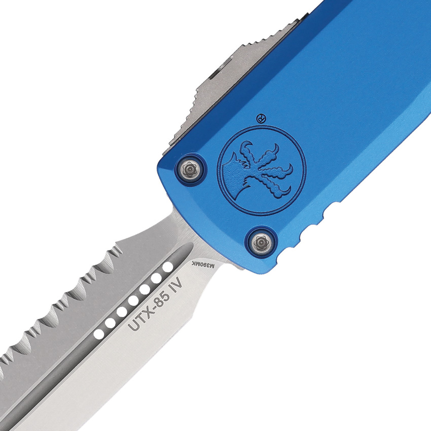 Automatic opening. 4.5″ (11.43cm) closed. 3.13″ (7.95cm) stonewash finish serrated Bohler M390MK stainless dagger blade. Blue aluminum handle. Glass breaker. Lanyard hole. Pocket clip. Boxed.