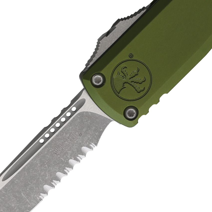 Automatic opening. 4.63″ (11.76cm) closed. 3″ (7.62cm) Apocalyptic finish partially serrated Bohler M390MK stainless blade. OD green aluminum handle. Pocket clip. Lanyard hole. Glass breaker. Boxed.