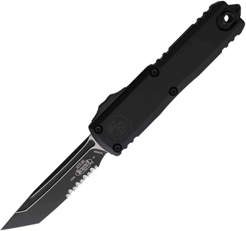 Automatic opening. 4.63″ (11.76cm) closed. 3″ (7.62cm) two-tone finish partially serrated Bohler M390MK stainless tanto blade. Black aluminum handle. Pocket clip. Lanyard hole. Glass breaker. Boxed.