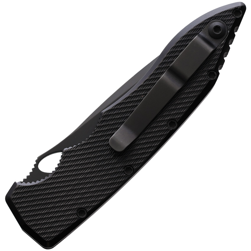 Automatic opening. 4.25″ (10.8cm) closed. 3.5″ (8.89cm) black oxide coated partially serrated CPM S30V stainless spear point blade. Black aluminum handle. Pocket clip. Thumb pull. Boxed.