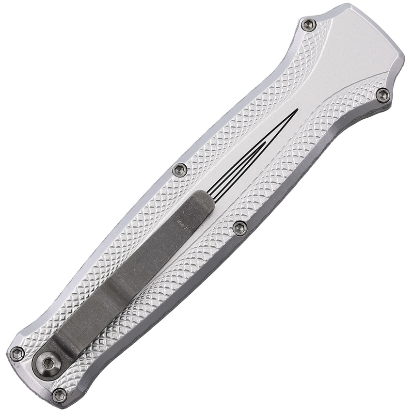 Automatic opening. 4.75″ (12.07cm) closed. 3.5″ (8.89cm) mirror finish double edge 154CM stainless dagger blade. Silver aluminum handle. Pocket clip. Boxed.