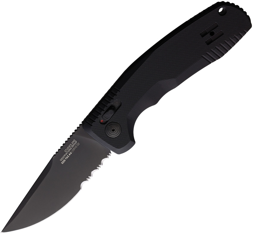 Automatic opening. 4.63″ (11.76cm) overall. 3.5″ (8.89cm) black TiNi coated partially serrated D2 tool steel blade. Black anodized aluminum handle. Lanyard hole. Pocket clip. AU-XR Double-Action Safety. Boxed.