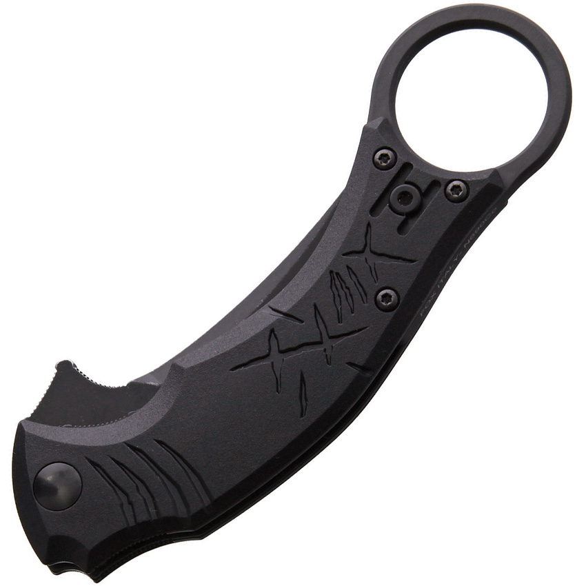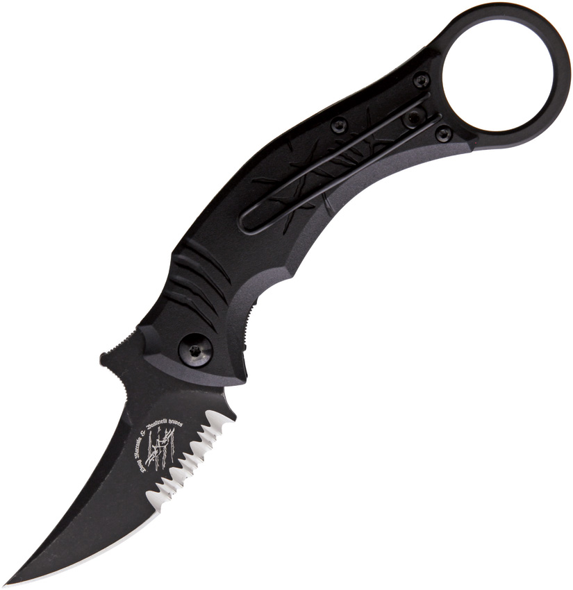 4.75″ (12.07cm) closed. 2.75″ (6.99cm) black finish partially serrated D2 tool steel blade. Black nylon handle. Extended tang. Finger ring. Pocket clip. Boxed.