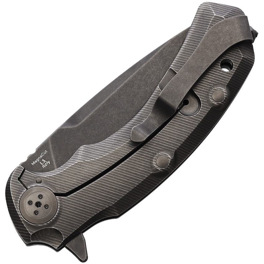 5″ (12.7cm) closed. 3.75″ (9.53cm) black stonewash finish Magnacut steel drop point blade. Titanium handle. Extended tang. Lanyard hole. Pocket clip. Glass breaker. Features the IKBS ball bearing system. Manufactured by Lion Steel. Boxed.