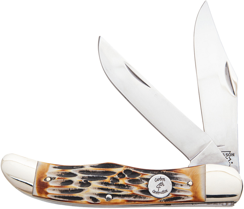 5.25″ (13.34cm) closed. Satin finish 1095HC steel clip and skinner blades. India stag bone handle. Nickel silver bolster(s). Inlay shield. Brown leather belt sheath. Boxed.