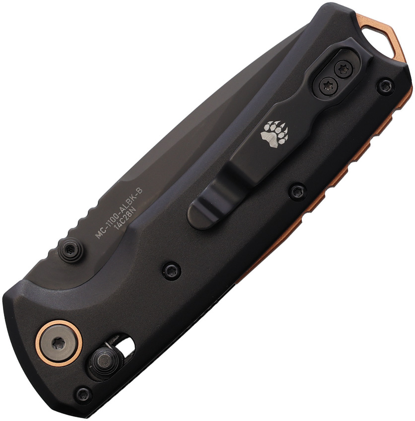 4.25″ (10.8cm) closed. 3.25″ (8.26cm) black finish 14C28N Sandvik stainless drop point blade. Black aluminum handle. Pocket clip. Thumb stud. Lanyard hole. Copper accents. Boxed.