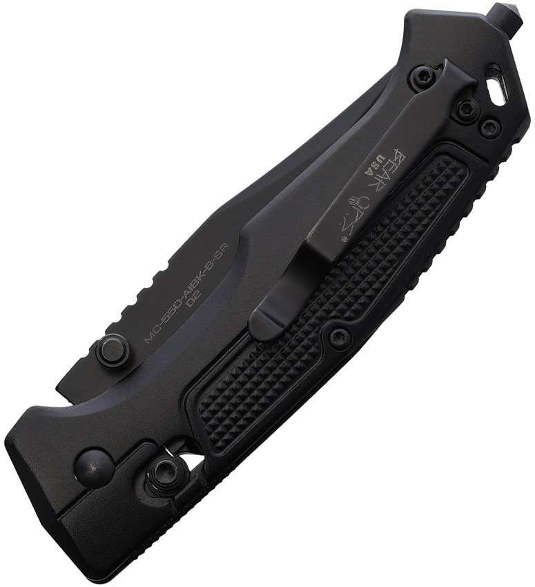 4.5″ (11.43cm) closed. 3.25″ (8.26cm) black finish partially serrated 14C28N Sandvik stainless clip point blade. Black textured aluminum handle. Glass breaker. Lanyard hole. Pocket clip. Thumb stud. Boxed.