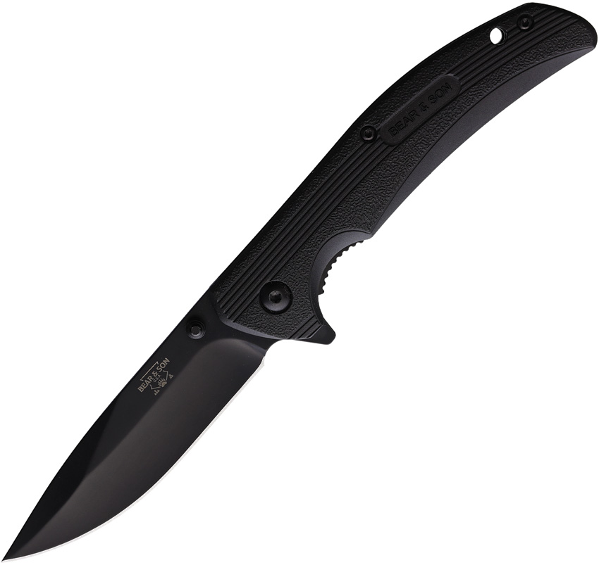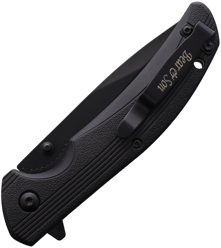 4.5″ (11.43cm) closed. 3.5″ (8.89cm) black finish stainless blade. Black Zytel handle. Thumb stud. Extended tang. Lanyard hole. Pocket clip. Boxed.
