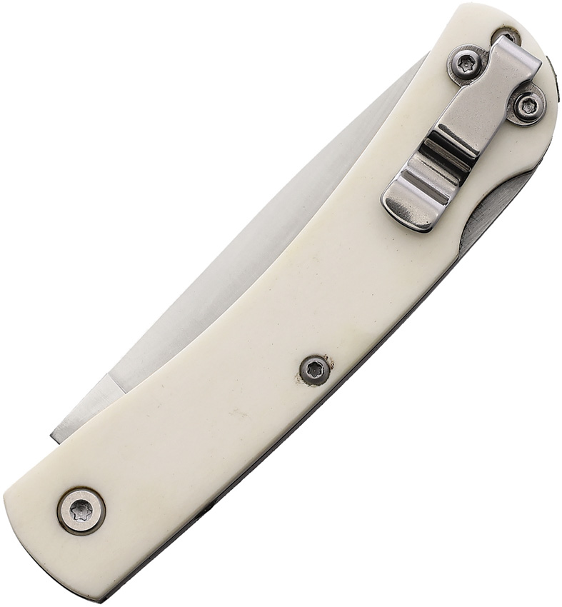 3.63″ (9.22cm) closed. 2.63″ (6.68cm) satin finish stainless blade. White smooth bone handle. Pocket clip. Boxed.