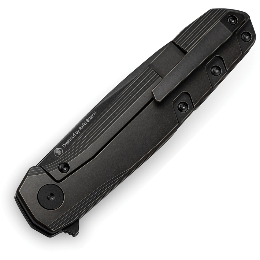 4.75″ (12.07cm) closed. 3.75″ (9.53cm) black stonewash finish Bohler M390 stainless blade. Black stonewash finish titanium handle. Extended tang. Pocket clip. Black nylon zippered storage case. Boxed.