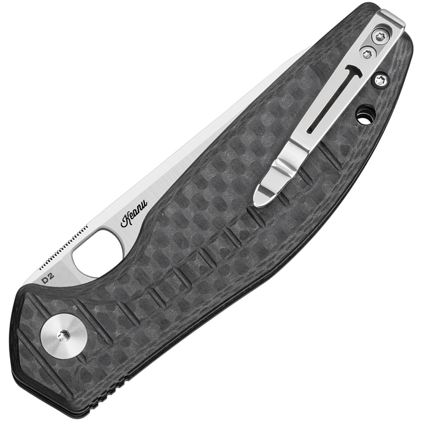 4.5″ (11.43cm) closed. 3.25″ (8.26cm) stonewash and satin finish D2 tool steel blade. Black carbon print G10 handle. Thumb pull. Lanyard hole. Pocket clip. Boxed.