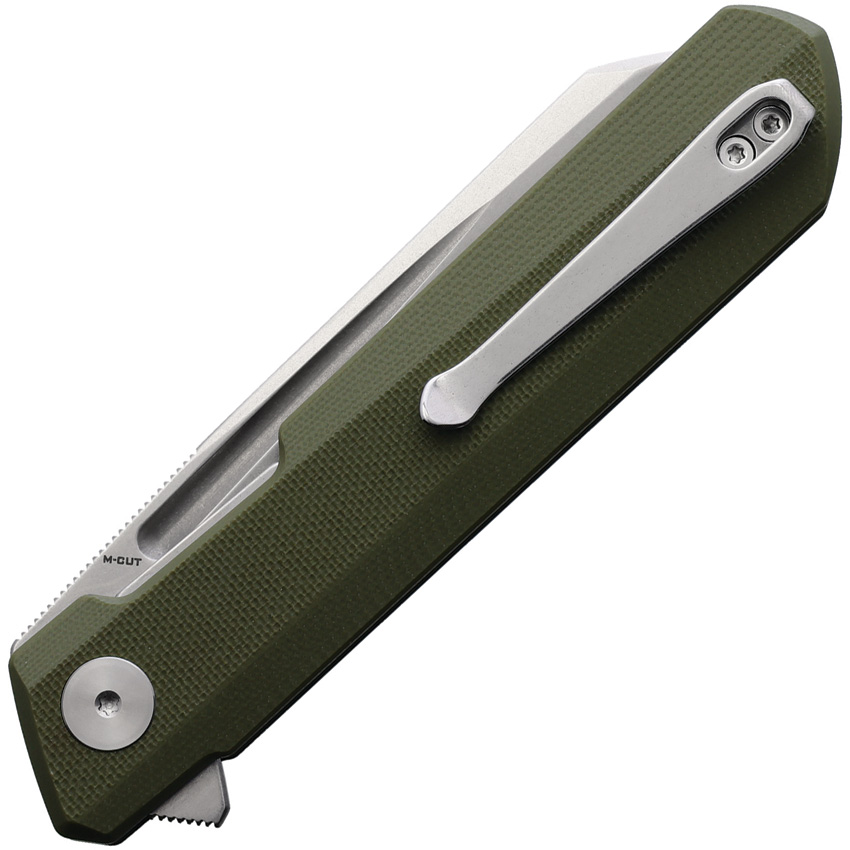 4.63″ (11.76cm) closed. 3.5″ (8.89cm) stonewash finish M-Cut sheepsfoot blade. OD green G10 handle. Extended tang. Pocket clip. Boxed.