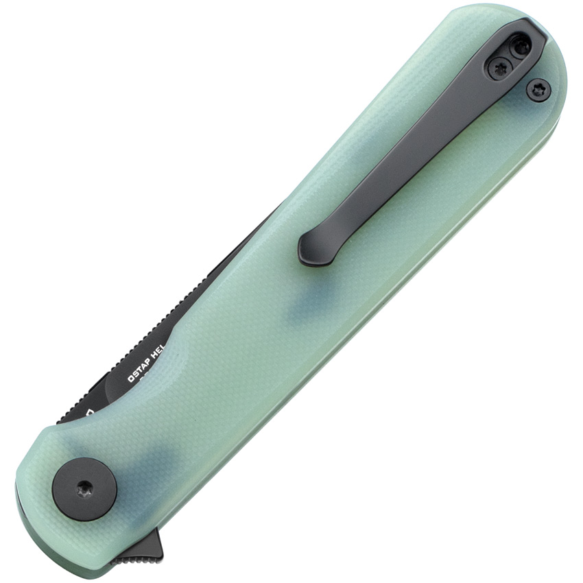 4.5″ (11.43cm) closed. 3.5″ (8.89cm) black PVD coated D2 tool steel blade. Jade G10 handle. Extended tang. Pocket clip. Boxed.