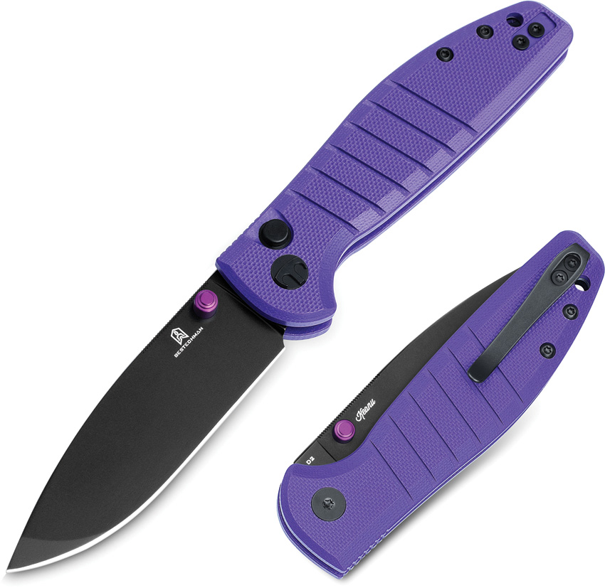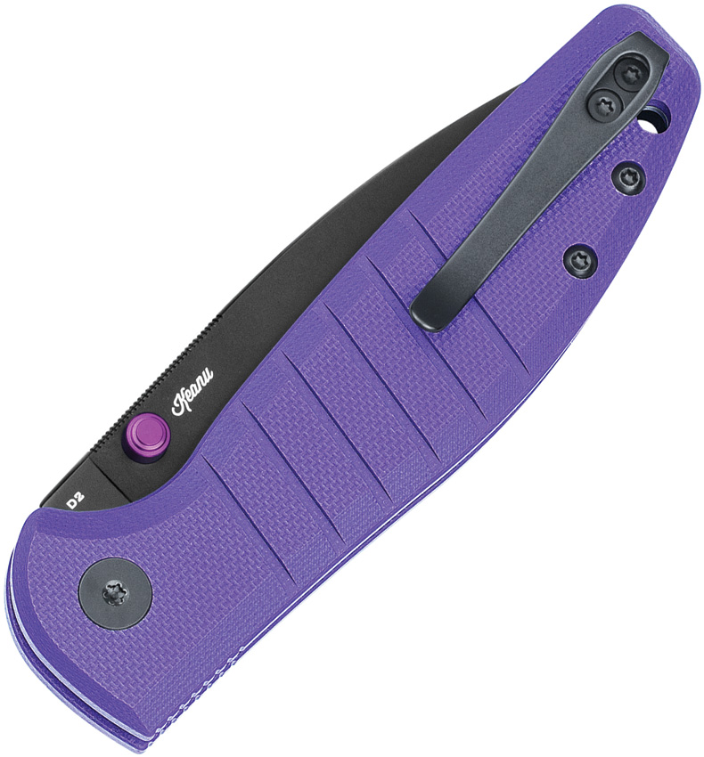 4″ (10.16cm) closed. 2.88″ (7.32cm) black PVD coated D2 tool steel drop point blade. Purple G10 handle. Thumb stud. Lanyard hole. Pocket clip. Boxed.