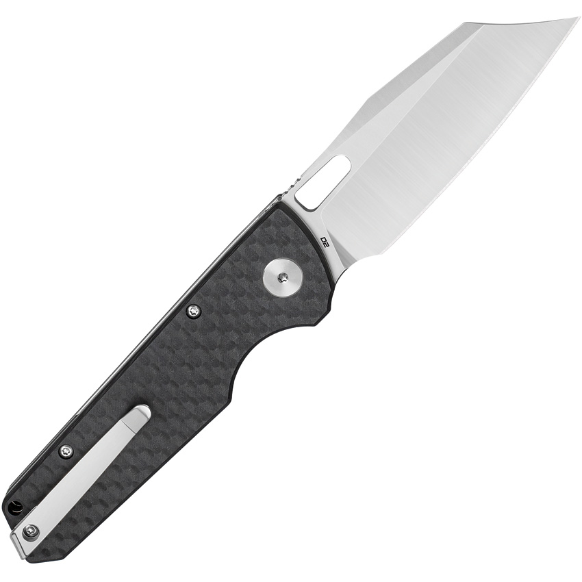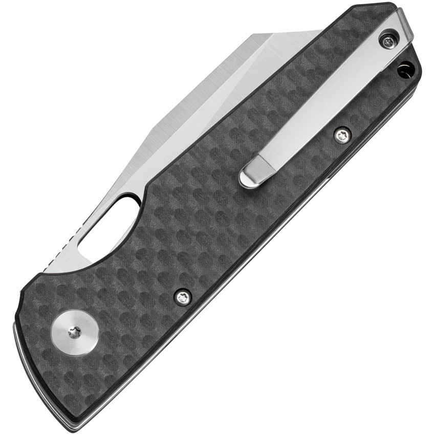 4.38″ (11.13cm) closed. 3.25″ (8.26cm) satin finish D2 tool steel blade. Black G10 handle. Thumb pull. Lanyard hole. Pocket clip. Carbon fiber pattern handle. Boxed.