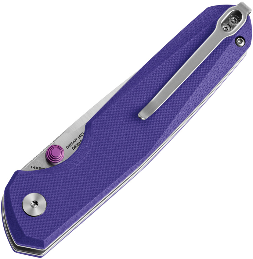 4.38″ (11.13cm) closed. 3.25″ (8.26cm) stonewash and satin finish 14C28N Sandvik stainless blade. Purple G10 handle. Thumb stud. Pocket clip. Boxed.