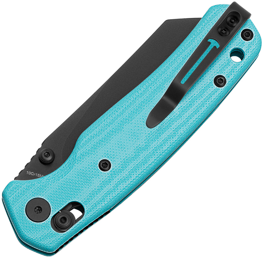 4.13″ (10.49cm) closed. 3.13″ (7.95cm) black PVD coated 10Cr15CoMoV stainless blade. Light blue G10 handle. Thumb stud. Lanyard hole. Pocket clip. Boxed.