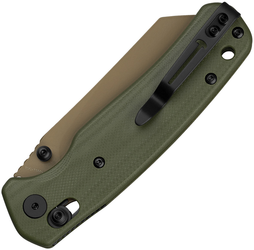 4″ (10.16cm) closed. 3.13″ (7.95cm) gold finish 10Cr15CoMoV stainless reverse tanto blade. OD green G10 handle. Thumb stud. Lanyard hole. Pocket clip. Boxed.