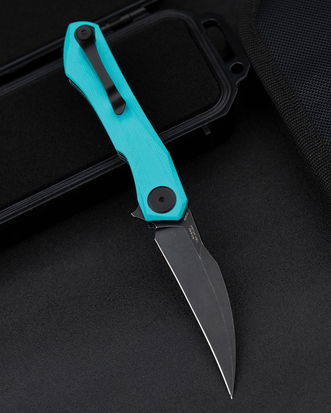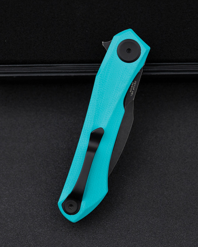 4″ (10.16cm) closed. 3″ (7.62cm) black stonewash finish 14C28N Sandvik stainless blade. Teal G10 handle. Extended tang. Pocket clip. Boxed.