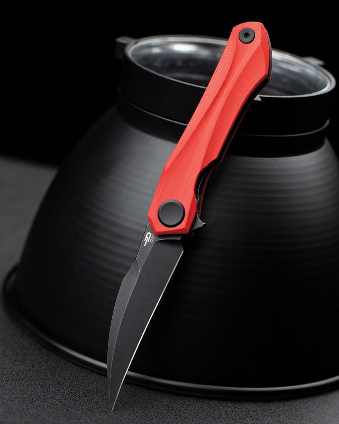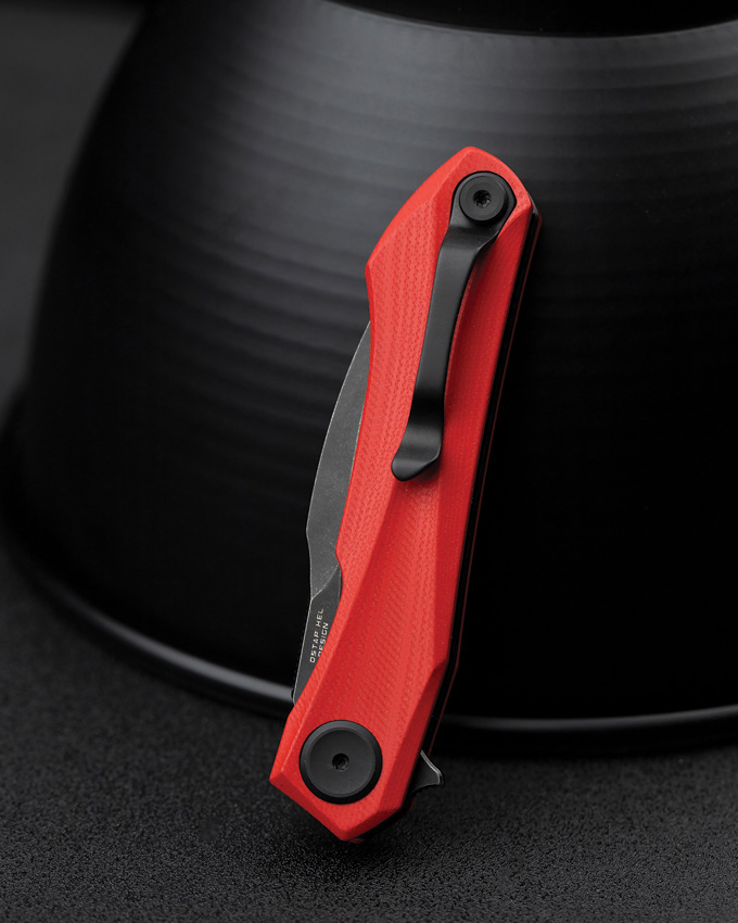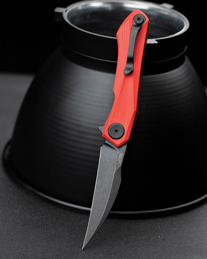 4″ (10.16cm) closed. 3″ (7.62cm) black stonewash finish 14C28N Sandvik stainless blade. Red G10 handle. Extended tang. Pocket clip. Boxed.