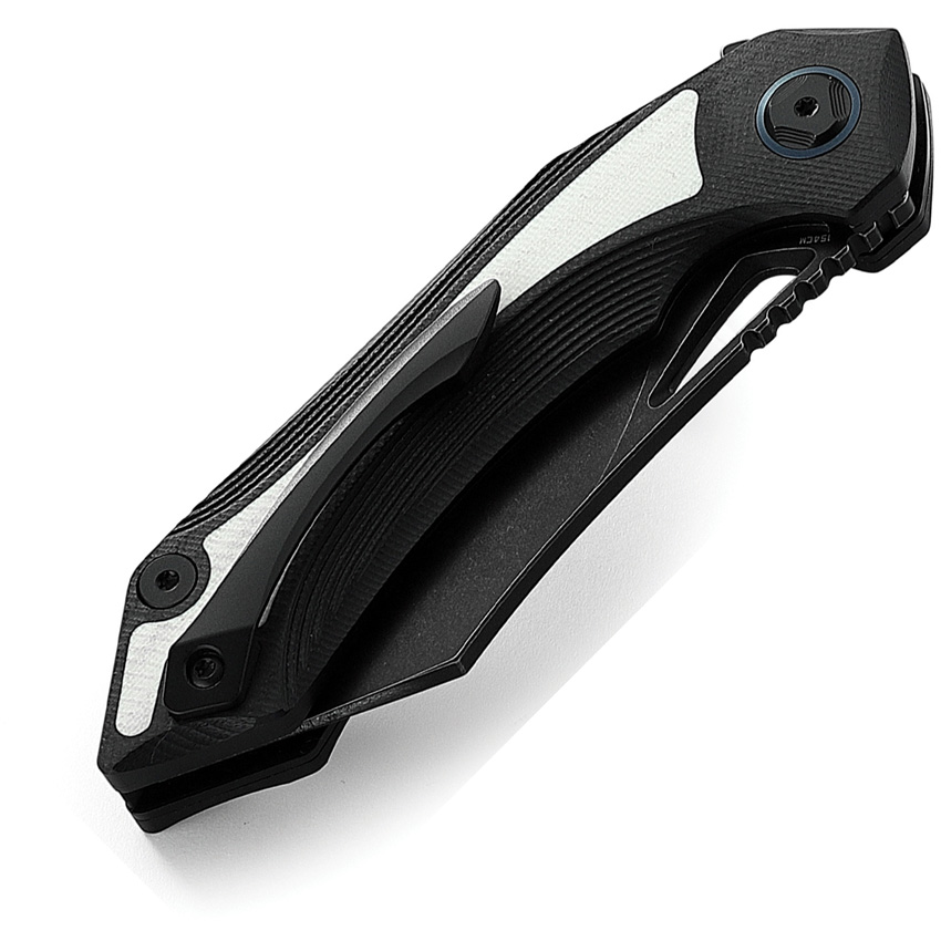 4.5″ (11.43cm) closed. 3.5″ (8.89cm) black stonewash finish 154CM stainless blade. Black and white G10 handle. Extended tang. Thumb pull. Pocket clip. Black nylon zippered storage case. Boxed.