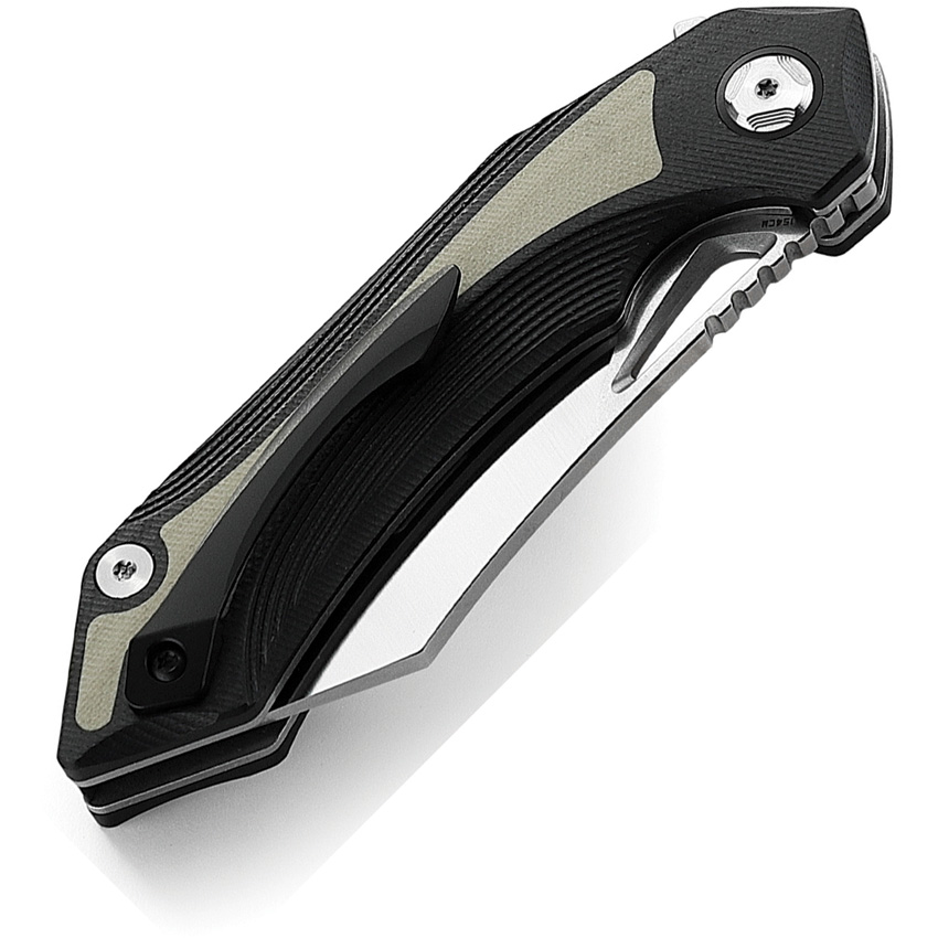 4.5″ (11.43cm) closed. 3.5″ (8.89cm) satin finish 154CM stainless blade. Black and tan G10 handle. Extended tang. Thumb pull. Pocket clip. Black nylon zippered storage case. Boxed.