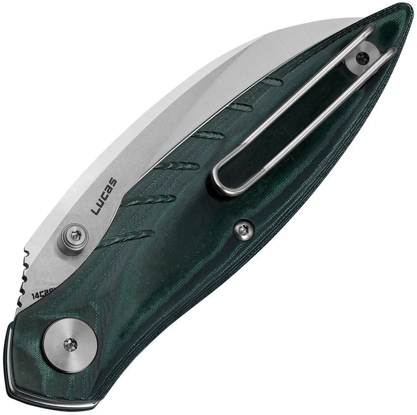 4″ (10.16cm) closed. 3″ (7.62cm) stonewash and satin finish 14C28N Sandvik stainless curved blade. Green micarta handle. Thumb stud. Pocket clip. Boxed.