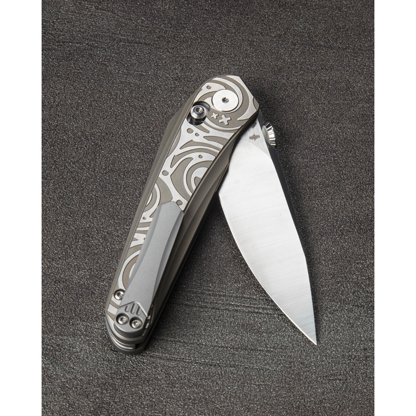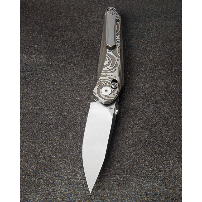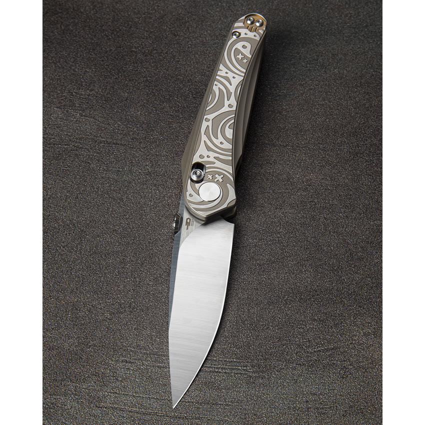 4.5″ (11.43cm) closed. 3.5″ (8.89cm) satin finish Bohler M390 stainless blade. Bronze and gray titanium handle. Thumb disk. Pocket clip. Black nylon zippered storage case. Boxed.